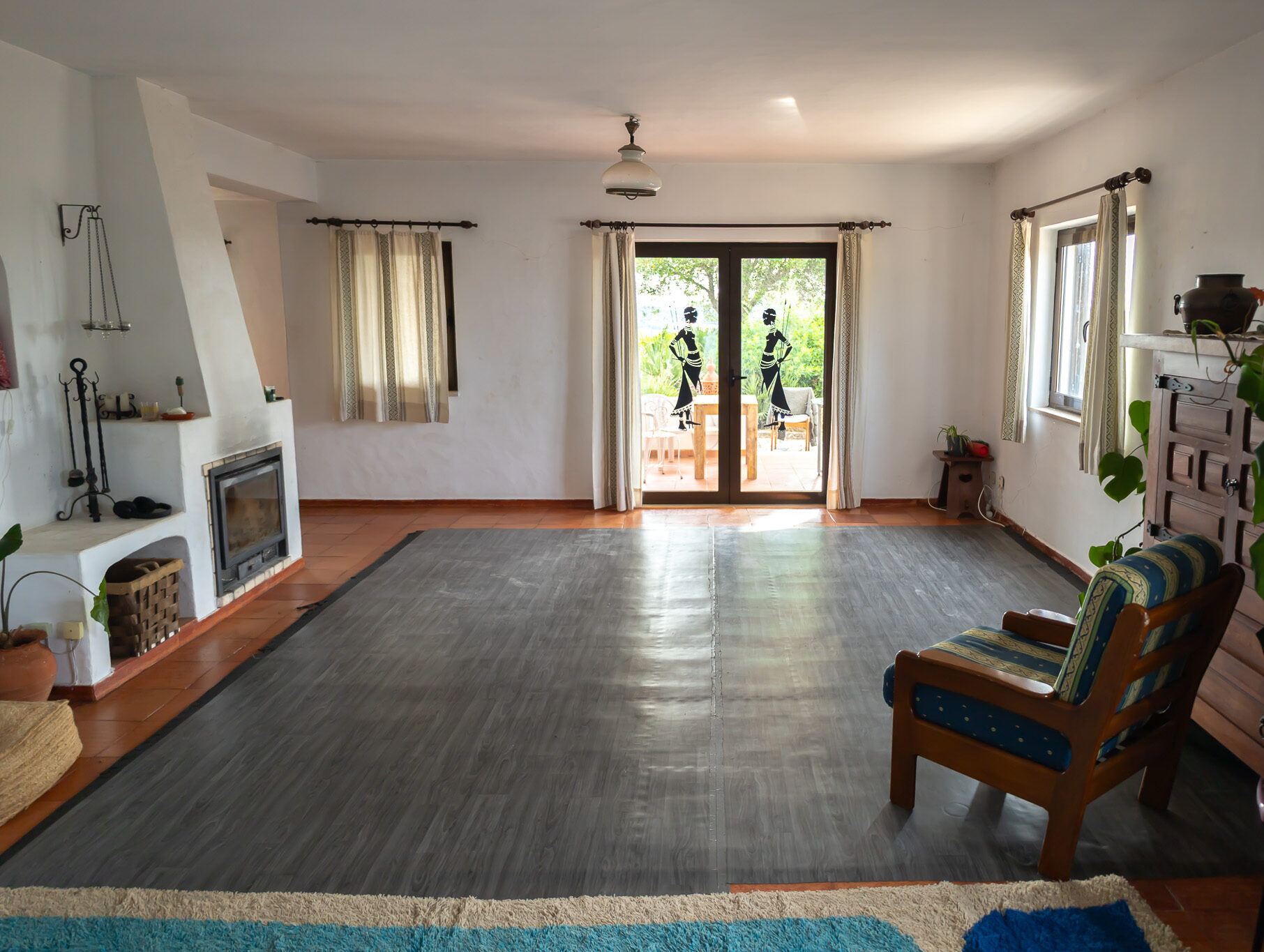 Practice takes place in a large living room with soft linoleum floors — perfect for movement. The venue also includes:
